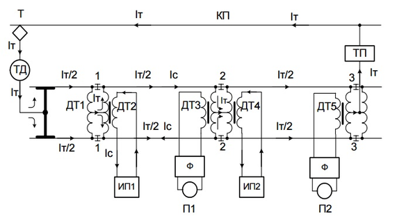 Для канализации обратного тягового тока (Iт на рисунке 1.3) изолированные путевые участки, оборудованные рельсовыми цепями, соединяются между собой стыковыми дроссель-трансформаторами(ДТ на рисунке 1.3), (двухниточные рельсовые цепи) и тяговыми соединителями (однониточные рельсовые цепи) [2].