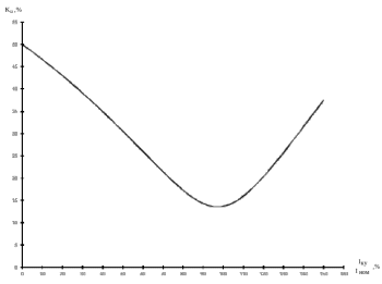 Данная зависимость параболического вида имеет точку минимума (экстремум). На графике координаты данной точки отмечены штриховыми линиями. Ей соответствуют значение коэффициента несимметрии около 13-14% и значение тока КУ примерно 97-98% от номинального тока (т.е. тока плеча). Если сложить ток КУ и ток отстающего плеча, то получим следующий результат: