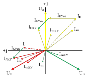Штриховыми линиями на диаграмме обозначены векторы тока правого плеча (соответствующий сумме токов всех электровозов на участке) и токов в обмотках трансформатора без учета КУ. Сплошными линиями показаны эти же векторы после введения в диаграмму вектора тока, соответствующего работающему КУ. Диаграмма соответствует практически полной компенсации (ток IП почти совпадает с вектором напряжения UA). Уже из диаграммы видно, что происходит с токами: уменьшается угол φп и модуль тока правого плеча, за счет этого меняются векторы токов обмоток – увеличивается ток в недогруженной обмотке и уменьшается в рабочих фазах, а также становятся другими углы сдвига фаз между этими токами, т.е. уменьшается их несимметрия. Данная векторная диаграмма дает наглядное объяснение, как КУ уменьшает потери мощности и снижает несимметрию.