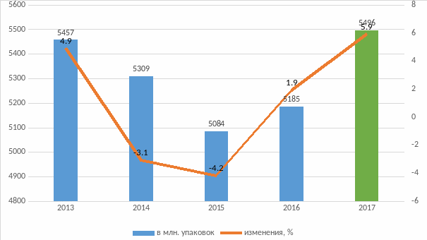 After a significant fall in 2013-2015, the volume of sales of drugs, shows a positive trend, and in 2016 increased by 1.9%, which was 5185 million packages. According to experts, to 2017, the sales volume in natural expression will continue their growth and to the end of the year of 5.9% (figure 5).
