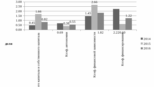 На основе данных бухгалтерского баланса ООО «Пластик Плюс» за период 2014-2016гг. были рассчитаны относительные коэффициенты финансовой устойчивости. По результатам анализа представленной в таблице 2.5 можно сделать вывод о том, что предприятие финансово устойчивое. Но все же, не все относительные показатели соответствуют нормативным значениям. На 2014 год коэффициент обеспеченности собственных оборотных средств равен норме, но в 2015 году ситуация ухудшилась, данный показатель ниже нормы, что говорит о том, что у предприятия недостаточно собственных оборотных средств. На 2016 год данный показатель равен норме. Коэффициент обеспеченности материальных запасов собственными средствами на 2016 год составляет 1,88 по сравнению с 2015 годом он вырос в 6 раз, это связанно с увеличением собственных средств предприятия и снижением доли внеоборотных активов. Коэффициент маневренности показывает, какая часть собственных средств организации находится в мобильной форме, позволяющей относительно свободно маневрировать данными ресурсами [17]. За последний год коэффициент маневренности вырос, на 2014 год он составляет 1,0, что превышает рекомендуемое значение. Негативным моментом следует считать снижение значения данного коэффициента в 2015 году на 132%, но на 2016 год значение этого показателя стало соответствовать норме. Как показано на рисунке 2.4, коэффициент автономии в течение трех лет соответствует норме, только на 2015 год наблюдалось небольшое снижение, следовательно, у предприятия наблюдается стабильность финансовой устойчивости. Коэффициент финансовой зависимости на 2016 год равен 1,82, данный коэффициент превышает норму, следовательно, предприятие в какой-то мере зависит от внешних источников финансирования. Коэффициент соотношения заемного капитала и собственного капитала за анализируемый период также изменялся, на 2014 год он составил 0,45%, на 2015 год он равен 1,66%, и на 2016 год равен 0,82%. На 2016 год наблюдается сокращение плеча финансового рычага, что свидетельствует о снижении финансовой зависимости от внешних инвесторов на конец исследуемого периода. Коэффициент финансирования на 2015 год ниже рекомендуемого значения, следовательно у предприятия, на данный период времени, активы были сформированы за счет заемного капитала, но на 2016 год ситуация изменилась и предприятие стало менее зависимо от внешних источников финансирования.