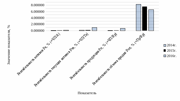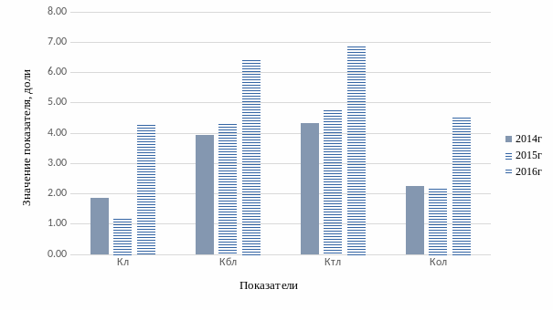 Чтобы более наглядно рассмотреть динамику рассчитанных показателей, была построена гистограмма за 2014-2016гг. по некоторым из них.