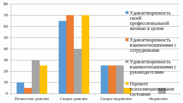 Для ранжирования была выбрана четырехуровневая шкала с позициями от «Полностью доволен» до «Недоволен». При ранжировании полученных данных на первом месте оказалась группа, оценившая свою степень удовлетворенности как «Скорее доволен» (65%), вторую позицию составила группа «Скорее недоволен» (25%), полностью довольны условиями для профессиональной реализации составили третью по величине группу (10%); недовольных в удовлетворенности своей профессиональной жизнью не оказалось среди опрашиваемых. Можно говорить и о положительной оценке служащими своего психоэмоционального состояния во время работы, поскольку им остались довольны 95% респондентов.