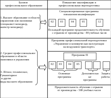 Обучение проводится в соответствии с Федеральным законом «О дополнительном профессиональном образовании». В зависимости от базового профессионального образования и занимаемой должности руководящий состав и ведущие специалисты российских авиапредприятий должны периодически проходить повышение квалификации по одной из 11 программ повышения квалификации или при отсутствии базового высшего образования в области управления и экономики – профессиональную переподготовку. Система рекомендуемого дополнительного профессионального образования изображена на рисунке 4.