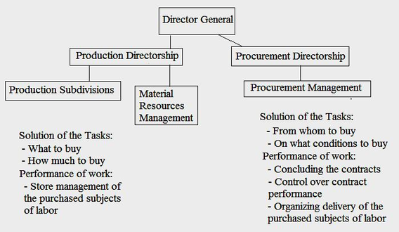 In Figure 1, the version of the enter prise organizational structure with the distribution of the above tasks between different functional units is given. The decision on what to buy and how much to purchase is made by the Production Management. The work on storing the purchased items of labor is also performed here.