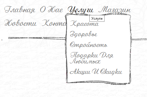 Для меню в информационной части Web-приложения выбран шрифт бледно-серого цвета размером 30px. При наведении цвет текста в меню меняется на черный. Подменю стилизованно под общую концепцию web-приложения, имеет белый фон, рисованную от руки рамку, размер шрифта 26px. Меню информационной части представлено на рисунке 3.2.