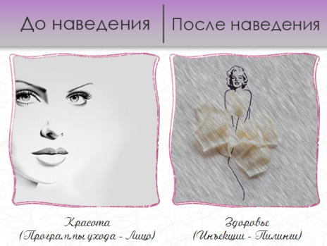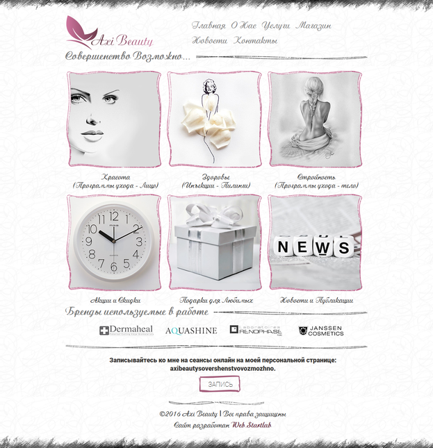 Разделы «Красота», «Здоровье», «Стройность» содержат в себе большое описание информации, для ее структурирования используются вложенные друг в друга выпадающие панели. Раздел «Подарки для любимых» содержит в себе информацию о сертификатах, реализуемых компанией в своей профессиональной деятельности. Раздел «Акции и скидки» информирует пользователей об интересных акциях и скидках проходящих в компании.