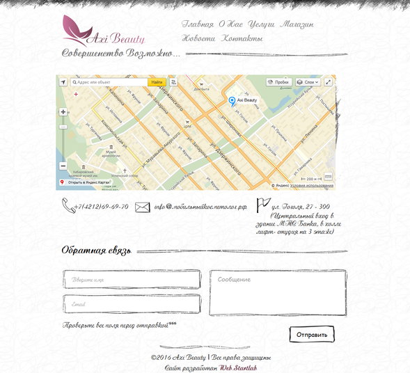 Раздел «Контакты» имеет на всю ширину экрана интерактивную карту проезда, также номер телефона, почту, и полный адрес. Ниже представлена контактная форма, отображение стандартных элементов которой изменены в соответствии с дизайном. Макет раздела «Контакты» представлен на рисунке 3.5.