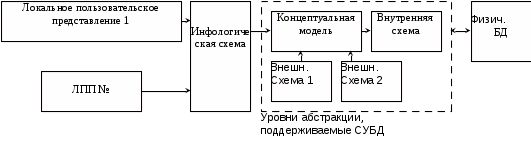 Обозначенные виды схем связывают больше с этапом эксплуатации БД, когда БД уже спроектирована, и общая логическая схема нашла свое отражение в определенной СУБД.