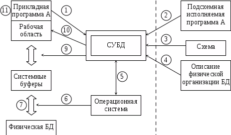 СУБД осуществляет сравнение схемы и подсхемы, выделяет ту логическую запись, которая запрошена прикладной программой. Любое преобразование данных, необходимость которого возникает из-за различий в описании одних и тех же данных в схеме и подсхеме, выполняется СУБД.