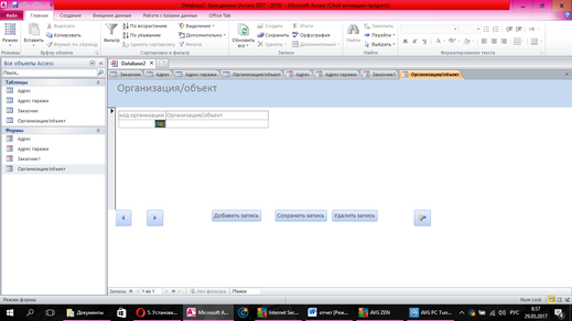 Следующим шагом было создание связи между таблицами(рисунок 15).Из схемы данных видно, что таблица «заказчик» связана с таблицей «адрес гаражи» и «адрес» связью один-ко-многим, так же как и таблица «организация/объект» с «адрес».