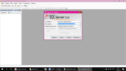 После запуска программы, на экране появляется диалоговое окно в котором нужно выбрать тип сервера, имя сервера и пройти проверку подлинности. Выбираем нужные значения и нажимаем кнопку «соеденить».
