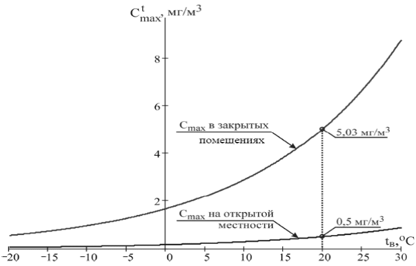 Характер изменения максимальной концентрации пара серной кислоты в зависимости от температуры окружающего воздуха в закрытых помещениях и на открытой местности показан на рисунке 2.1 [13].