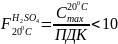 Максимальная концентрация на открытой местности, создаваемая парами серной кислоты при атмосферном давлении и температуре кипения 3300С, не превышает 0.5 мг/м3 (при 200С), то есть всего 0.5 ПДК H2SO4 (ПДК серной кислоты в воздухе составляет 1 мг/м3), а при аварийных выбросах внутри помещений (при отсутствии вентиляции) около 5 мг/м3, то есть 5 ПДК. Таким образом для концентрированной серной кислоты (92.5-94%) используемой на рассматриваемом объекте, относительная летучесть не превышает