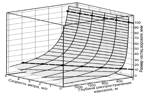 Глубина распространения аэрозоля существенно зависит от размера частиц и скорости приземного ветра. Данная зависимость для рассматриваемой высоты обрушения столба жидкости на подстилающую поверхность показана на рисунке 2.3.