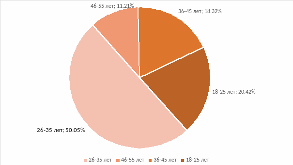 Преобладающим возрастом в 2015 г является возраст от 26-35 лет, это составляет 49%; затем возраст от 18-25 лет - 20%; 36-45 лет составляет 18%; 11% - люди от 46-55 лет.