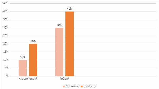 На рисунке 6 видно, что классический график работы предпочитают женщины 20% - 4 человека и 10% - 2 мужчины, так же как и гибкий график 30% мужчин 6 чел и 40% женщин 8 человек.