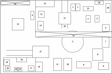 На рисунке 2.1 приведен план контрольного пункта автосцепки, по месту прохождения преддипломной практики, где: 1 – Позиция входного контроля корпусов автосцепок и тяговых хомутов; 2 – позиция дефектоскопирования тяговых хомутов; 3 – позиция дефектоскопирования автосцепок; 4 – позиция МПК клина тягового хомута, маятниковых подвесок; 5 – поворотный стенд для разборки, ремонта и сборки автосцепок; 6 – стол для обмера и ремонта деталей механизма сцепления; 7 – стол для осмотра клина тягового хомута, маятниковых подвесок; 8 – горизонтально-фрезерный станок 6Т-82-Г; 9 – обдирочно-шлифовальный станок; 10 – стенд для правки корпуса автосцепки; 11 – специализированная электропечь для нагрева хвостовика автосцепки; 12 – стенд для сжатия поглощающих аппаратов; 13 – стенд для сжатия поглощающих аппаратов Ш-6-ТО-4; 14 – позиция осмотра центрирующих балочек (подпружиненных центрирующих балочек); 15 – стеллаж-накопитель деталей поглощающих аппаратов; 16 – рабочий стол сварщика; 17 – сварочный выпрямитель ВДМ-1001; 18 – реостаты баластные; 19 – стенд для наплавки хвостовиков автосцепок; 20 – приспособление для обработки шипа в корпусе автосцепки; 21 – фрезерный станок УФФ-5570М; 22– стеллаж для хранения дефектоскопов; 23 – дефектоскоп ДГСМ-53; 24 – кран-балка грузоподъемностью 0,5 тонн; 25 – кран-балка грузоподъемностью 0,25 тонн; 26 – путь для подачи автосцепок; 27 – тележка транспортировочная; 28 – стол бригадира; 29 – распределительный щит.