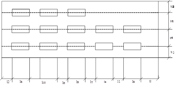 l1 – расстояние между вагонами, находящимися на ремонтных позициях, м, l1= 2 м;