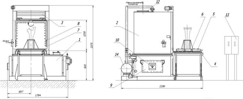 В камеру введена труба, на конце которой установлен верхний вращающийся разбрызгиватель 8, который свободно вращается под действием реактивной силы, создаваемой тангенциальными струями. Моющий раствор всасывается электронасосом 14 через фильтр из меньшего отделения бака и подается в разбрызгиватели. После мойки раствор стекает в большее отделение бака, из которого переливается в меньшее отделение.