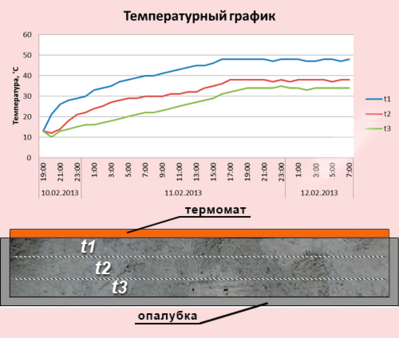 Как видно, в течение 22 часов в плите установилась средняя температура в 39 градусов Цельсия при колебаниях окружающего воздуха от минус 5 до минус 12 градусов Цельсия. За суммарное время прогрева в 36 часов бетон достиг прочности в 70 процентов. Расход энергии составил 43 кВт.