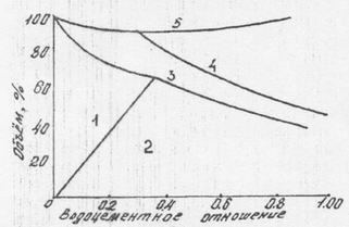 Как видно из рис. 1.1, при полной гидратации цемента, которая возможна только при очень тонком помоле (для обычных цементов не наступает даже через несколько лет), вода, заключенная в порах и капиллярах, вместе с воздухом в зависимости от исходного В/Ц, может составлять около 30-50% объема цементного камня. По мере уменьшения В/Ц уменьшается и объем воды, а вместе с ним и пористость цементного камня.