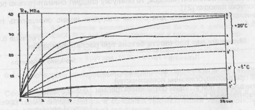 Прочность бетонов с противоморозными добавками в гораздо большей степени, чем у обычного бетона, зависит от условий твердения. Это можно объяснить двухстадийным твердением бетона. Причем на всех стадиях твердения сохраняется зависимость
