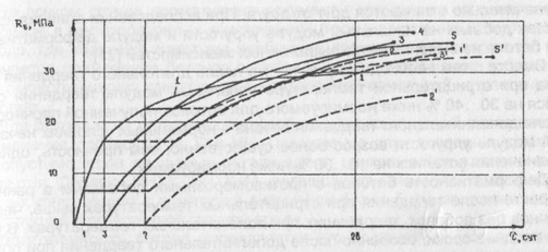 Рисунок 2.4 Кинетика изменения прочности бетона с добавкой 7% К2СО3 1-твердение в течение 28 сут в нормально-влажностных условиях;