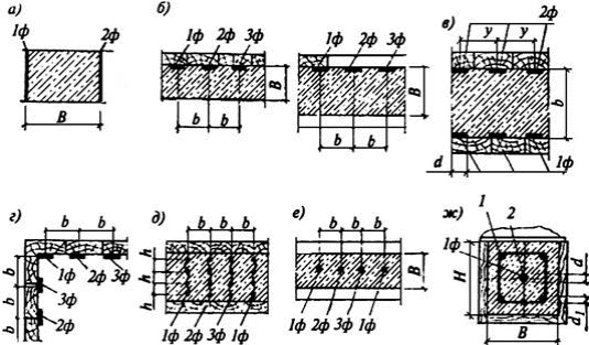 Рисунок 2.5 Схемы размещения электродов:а) пластинчатых;б) при периферийном прогреве;в) при двухстороннем сквозном прогреве; г) при периферийном прогреве массивных конструкций полосовыми электродами;д) при прогреве при помощи плоских групп стержневых электродов;е) при прогреве стержневыми электродами;ж) при прогреве струнными электродами;1ф, 2ф, Зф – фазы понижающего трансформатора; 1 – арматура; 2 – струны [29].