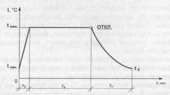 Рисунок 3.4 Режим прогрева «подъем - изотермический прогрев - остывание»: τп - время подъема температуры; τн - время изотермического прогрева; τо - время остывания; ОТКЛ. - момент отключения электрического тока