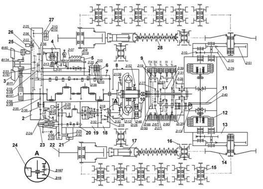 Рисунок 26 – Кинематическая схема бульдозера ДЗ-109 с гидромеханической трансмиссией.