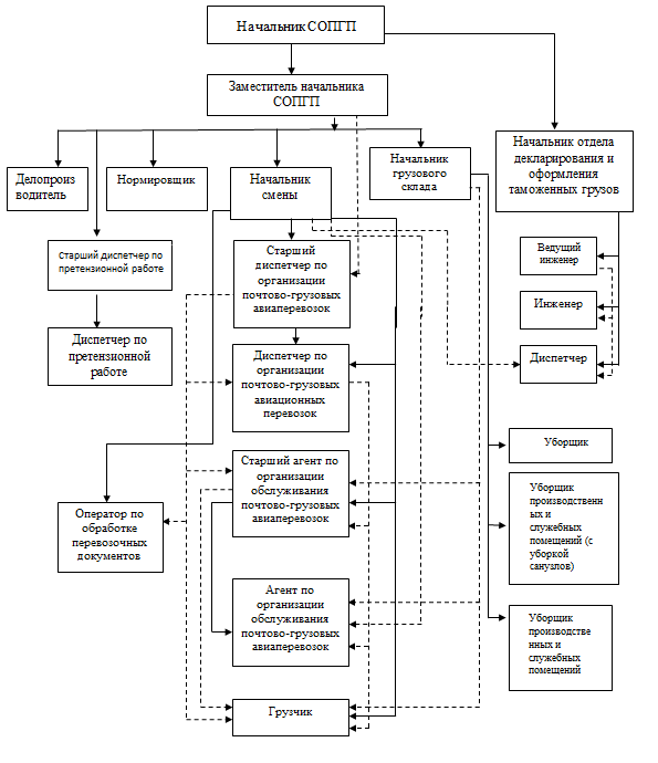 Рис. 2.4. Организационная структура СОПГП ОАО «Хабаровский аэропорт»: --- непосредственное подчинение, - - - оперативное подчинение