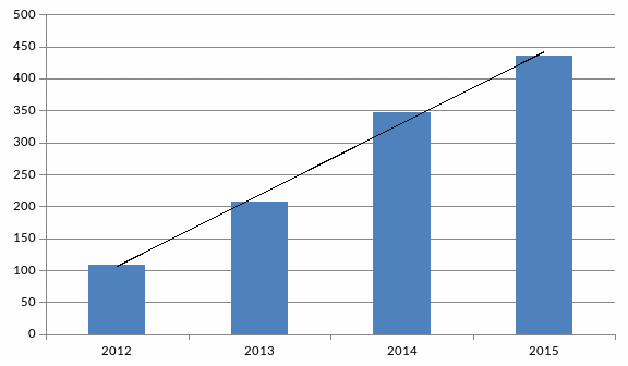 Это далеко не полный перечень экспедиторов, имеющих договор на обработку грузов с ПАО «ВМТП». Это самые крупные организации, занявшие свои позиции по количеству перерабатываемого груза. Если говорить обо всех компаниях, занимающихся внутрипортовым экспедированием в транспортном узле Владивосток, то их количество по статистике в период с 2012 по 2015 годы увеличилось со 109 до 435, что показано на рис.2.1.