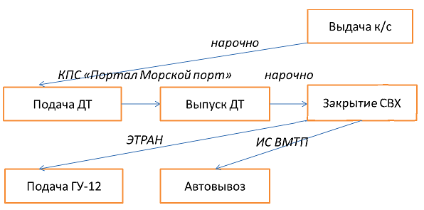 По прибытии судна в порт назначения морские коносаменты морским агентом выдаются грузовладельцу или его уполномоченному представителю (экспедитору) нарочно. Грузовладелец (представитель грузовладельца) в свою очередь передает таможенному декларанту морской коносамент для таможенного оформления. В данном обмене морской коносамент может передаваться нарочно или электронной связью. Это зависит от того, чьими силами будут проводиться действия с конечным пакетом документов. Декларанту для таможенного оформления необходима сканированная копия морского коносамента, которая с полным первичным комплектом документов на прибывший товар отправляется через программные средства таможенной службы для таможенного оформления. Оригинал коносамента декларанту необходим только в случае оформления таможенного транзита. Далее при получении информации о выпуске товара с таможенной территории таможенного союза от декларанта грузовладельцу или его уполномоченному представителю необходимо проставить отметки «выпуск разрешен, вывоз разрешен» на оригинале коносамента для осуществления процедуры закрытия склада временного хранения на прибывший и растаможенный груз. Это и называется действиями с конечным пакетом документов. Процедура закрытия склада временного хранения на прибывший и растаможенный груз также является бумажной, и осуществляется ни в одной зоне пограничного пункта пропуска. По окончании процедуры закрытия склада временного хранения на прибывший и растаможенный груз последующие действия вновь становятся «бумажными», в случае передачи груза на железную дорогу, или же электронными, в случае определения груза на местную выдачу. В этом случае в информационной системе «ВМТП» (ИС ВМТП) грузовладелец или его уполномоченный представитель (экспедитор) производят открепление груза на автоперевозчика с внесением необходимых данных для обработки груза уже автоперевозчиком. Процедура обработки груза, начиная от морского агента и заканчивая железнодорожным или автомобильным перевозчиком, может занимать от трех до десяти дней в зависимости от дня недели и времени получения информации о выпуске товара в программных средствах таможенной службы. Этот срок велик и требует сокращения, поскольку с момента поступления груза в порт до завершения его обработки все его содержание является платным для грузовладельца и влияет, в первую очередь, на конечную стоимость груза.