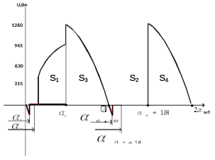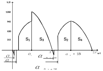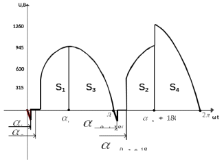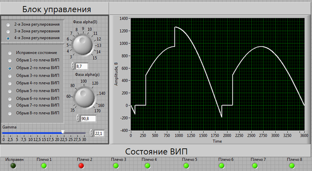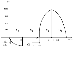 при определение обрыва 1-го и 2-го плеча для второй и четвертой зон, а также для 3-го и 4-го плеча третьей зоны регулирования. Причиной сбоя при малых углах регулирования является малая разность площадей S1 и S2, которая укладывается в допустимую погрешность и системой не распознается. При больших углах регулирования импульс отвечающий за открытие плеча также является не явным, и системой не распознается, а случае реальной работы ВИП, а не математического моделирования и вовсе может быть принят за колебание кривой. Исходя из этого, для исключения вышеназванных причин ограничения применимости алгоритма в рабочем состоянии ВИП, исходный алгоритм доработан и дополнен диагностическим признаком, выявленном в ходе моделирования.