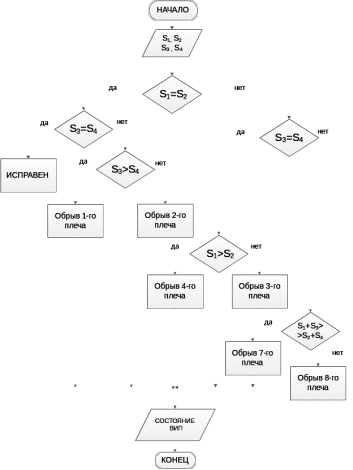 Если S1 ≠ S2; S3 ≠ S4, то поиск повреждений необходимо производить в плечах 7 и 8. В случае если S1 + S3 > S2 + S4, то произошел обрыв 7-го плеча ВИП (рисунок 2.16).
