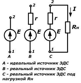 Теоретически на выводах у идеального источника напряжение не зависит от величины тока нагрузки и является постоянной величиной. Однако, это условная абстракция, которая не может быть осуществлена на практике. У реального источника при увеличении тока нагрузки значение напряжения на зажимах всегда уменьшается.