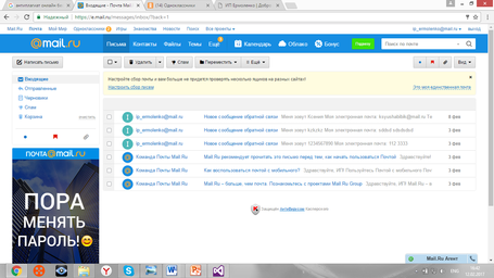 Для сайта был создан ящик, чтобы была возможность собирать обращения пользователей, которые они пишут через форму обратной связи. Данные для входа в ящик: ip_ermolenko@mail.ru, пароль: пароль:4a33N33w22vH.