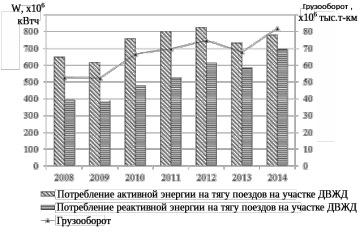 Железнодорожный транспорт является вторым видом транспорта в России по тоннажу перевезенных грузов. А с развитием добывающей промышленности растут объемы перевозок. Как частный пример рассмотрим участок Дальневосточной железной дороги Бира – Бикин, включающий девять тяговых подстанций. За период с 2008 по 2014 год фактический прирост грузооборота составил 55,48 %. При этом потребление электрической энергии также выросло. Причем потребление активной энергии выросло на 20,32%, а потребление реактивной энергии на 75,92%. Динамика изменения грузооборота и электропотребления представлена на рисунке 1.1.