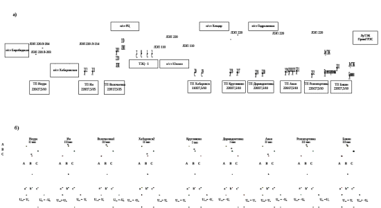 Рисунок 2.1 – Схема внешнего электроснабжения (а) и схема фазировки тяговых подстанций (б) Хабаровской ЭЧ ДВЖД