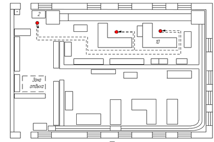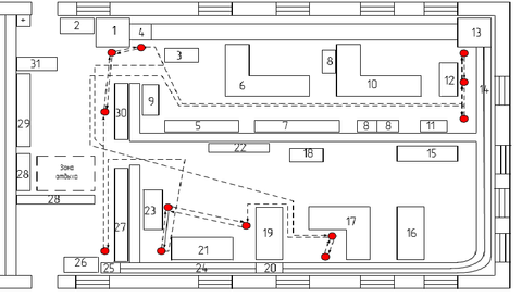 Зная размеры помещения, было определено сколько метров проходит слесарь при ремонте четырех соединительных рукавов, расстояние составило 28,2 метра при перемещении к ремонтной позиции и столько же обратно за новой партией. Шестьдесят четыре метра – расстояние, которое проходит рабочий при ремонте четырех концевых кранов.