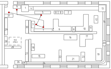 На диаграмме рисунок 3.15 видно как перемещается слесарь по рабочим позициям с новой расстановкой оборудования. Рабочий берет со стеллажа (31) неисправный авторегулятор и переносит его в емкость с керосином (7), где регулятор проходит обмывку и очистку. После обмывки, авторегулятор отправляет