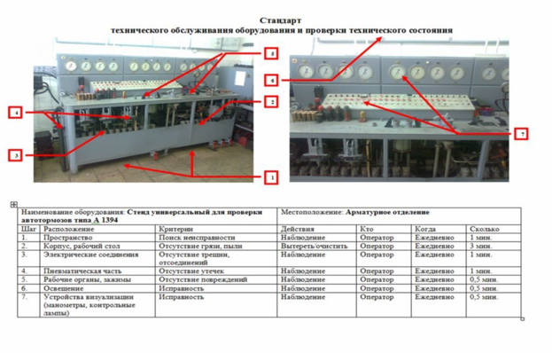 Каждый работник на своей зоне реализует первый этап – используются шаги 1 «Сортировка», 2 шаг «Соблюдение порядка», 3 шаг «Содержание в чистоте» системы 5С. На втором этапе описываются требования к рабочему месту (его характеристикам, инструментальному, информационному и другим видам оснащения , а так же разработанным на этапе 1 правила размещения предметов, уборки и т.п.) – используется шаг 4 «Стандартизация». На рисунке 3.17и на плакате ДП 23.05.03.В.156.11 изображена стандартизированная карта технического обслуживания и проверки технического состояния оборудования. Данная карта располагается на рабочем месте.