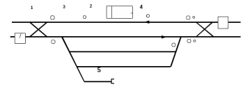 1 – перегонное средство технического диагностирования, 2 – прожекторы, 3 – колонки двухсторонней парковой связи, 4 – помещение ДСП с помещением обогрева ремонтно-смотровой бригады, 5 – тупик для вагонов, требующих текущего отцепочного ремонта.