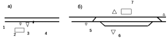 Рисунок 1.16 Схема размещение средств технологической оснастки на ПБ: а) на железнодорожном переезде; б) на промежуточной станции;1 – знак «пост безопасности» перед переездом; 2 – помещение дежурного по переезду; 3 – устройство обнаружения нижней негабаритности; 4 – переезд; 5 – знак «пост безопасности» перед станцией; 6 – прожекторные установки; 7 – помещение ДСП.