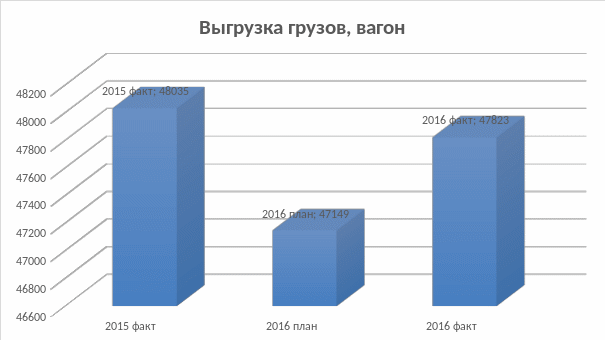 Изучив данные на рисунках 2.4, 2.5 можно сказать, что за 12 месяцев 2016 года станцией Благовещенск план выгрузки был выполнен на 101,4%, при плане 47149 вагонов выгрузка составила 47823 вагонов. В сравнении с 2015 годом выгрузка в вагонах снизилась на 0,4%, при этом выгрузка в тоннах к 2016 году составила 101,5%, это связано с увеличением статнагрузки выгружаемых вагонов – строительные грузы (цемент, кирпич).