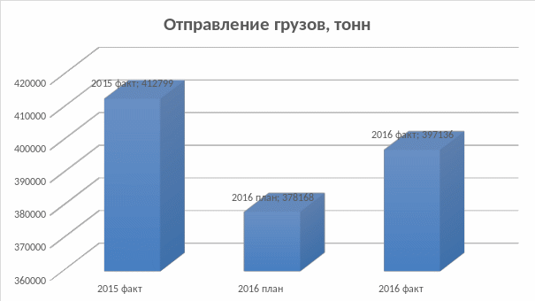 План отправленных грузов выполнен на 105,0%, при плане 378168 тонн погрузка составила 397136 тонн. В сравнении с 2015 годом погрузка снизилась на 3,8% за счет снижения погрузки зерновых по причине снижения сбыта у контрагента (ООО «Амурская зерновая компания», ООО «Мой город», ИП Викулов, ООО «ТЛК»), снижения погрузки машин и оборудования в связи с перевозкой их автотранспортом (ООО «Спецтранс, ТК Рефтранс-экспедиция, АРТК Сервис).