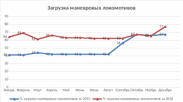 | Период | % загрузки маневровых локомотивов за 2015 | % загрузки маневровых локомотивов за 2016 |