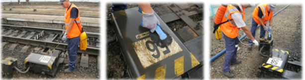 Далее начинается сама помывка напольных устройств. Нанесение раствора очистителя на напольное устройство СЦБ. Затем чистка устройства щеткой. В самом конце ополаскивание устройства водой.
