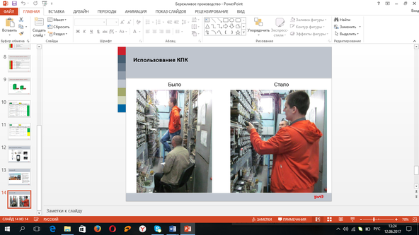 В соответствии со стандартом по качеству ОАО «РЖД» СТК 1.05.002. «Применение технологий бережливого производства при организации производственных и технологических процессов ремонта и эксплуатации технических средств», в соответствии с приказом начальника дороги от 02.03.2012 г № 82/Н «Об организации работ по внедрению технологий бережливого производства в структурных подразделениях, расположенных в границах Дальневосточной железной дороги», в целях повышения степени вовлеченности и мотивации специалистов структурных подразделений к улучшению производственных процессов и телеграфным указанием ШГИ Рудковского от 01.12.2013 г № ШТех 12/2 в дистанции были внедрены два проекта бережливого производства «Технология автоматизированного учета ремонта и замены аппаратуры СЦБ с применением КПК и штрих-кодирования в РТУ» и «Внедрение системы 5С организация рабочего места пост ЭЦ ст. Уссурийск.